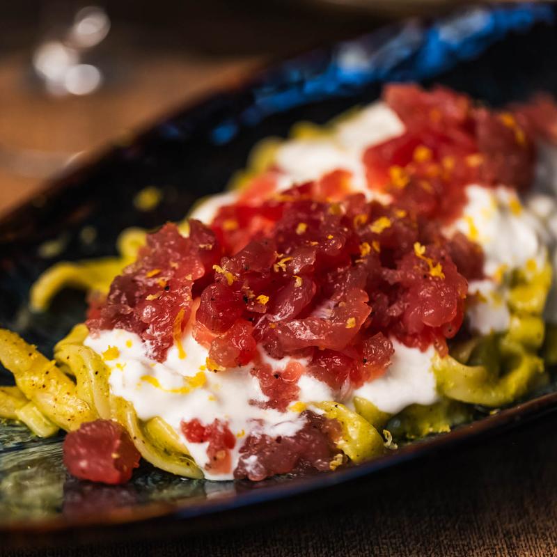 Ribbon pasta, broccoli rabe cream, black truffle, Calabrian sausage